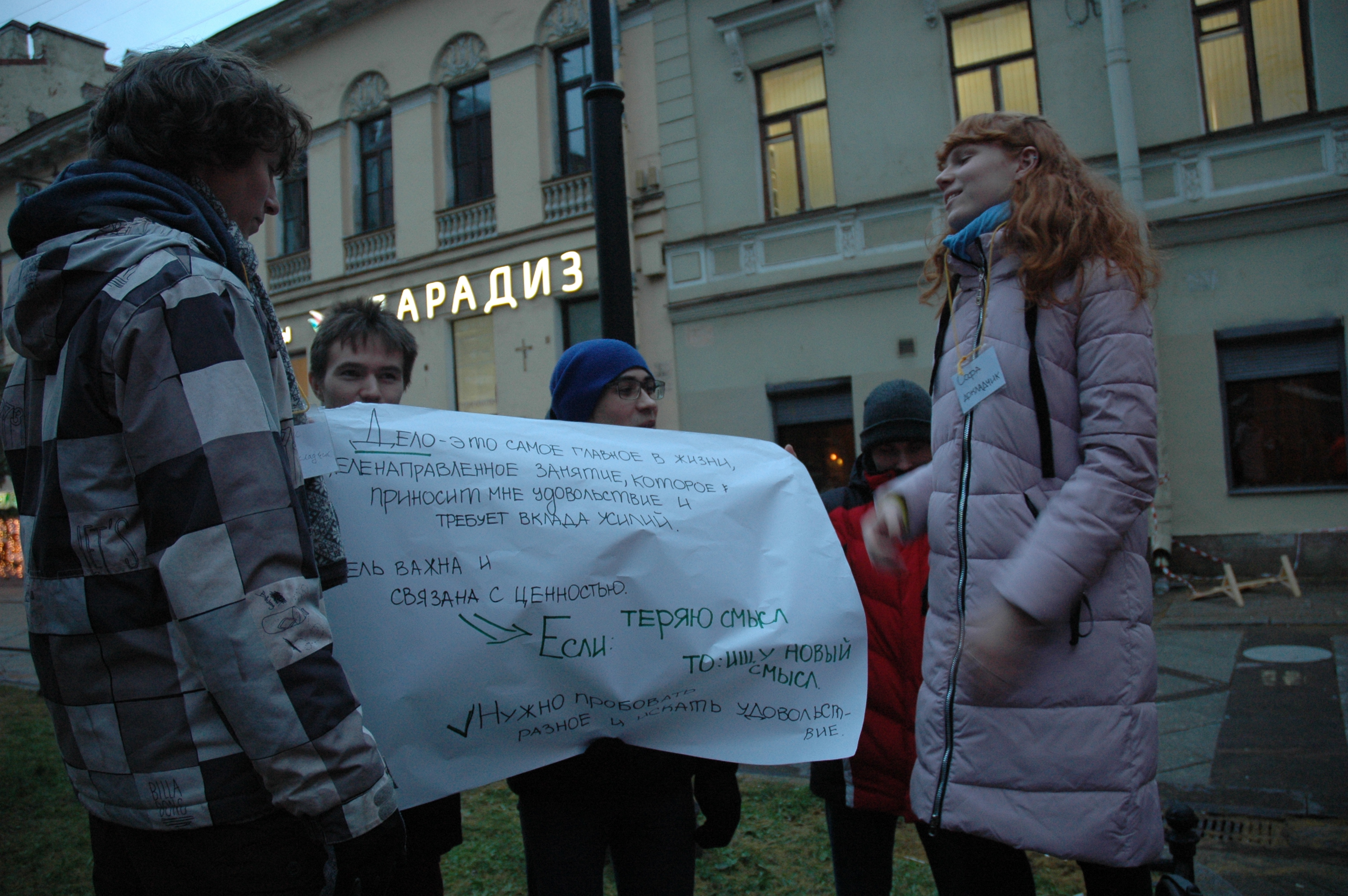 Уличный диспут на тему "что самое главное в жизни?". Рассмотрели 2 позиции - дело и отношения, коротко затронули драйв и развитие.